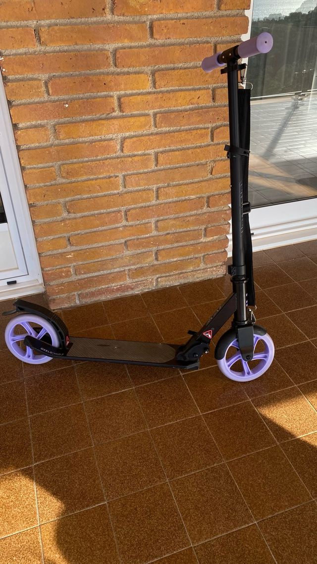 Detalles del productoPatinete plegable de Decathlon en color negro y lila. Ideal para desplazamientos urbanos.