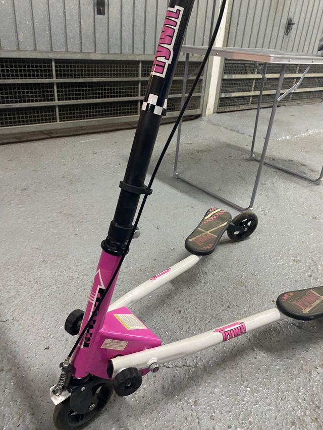 Patinete de dos ruedas con un llamativo diseño en color rosa y negro. - Manillar ajustable. - Ruedas de goma. - Plataformas para los pies.