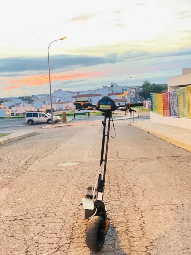 Patinete eléctrico con diseño moderno y ruedas todoterreno. - Manillar ajustable. - Plataforma ancha. - Rueda delantera de gran tamaño.