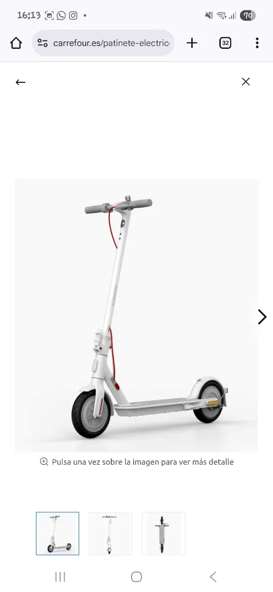 Patinete eléctrico en color blanco. - Diseño moderno y funcional. - Ruedas con llantas negras. - Manillar gris con puños negros. - Cable rojo visible.