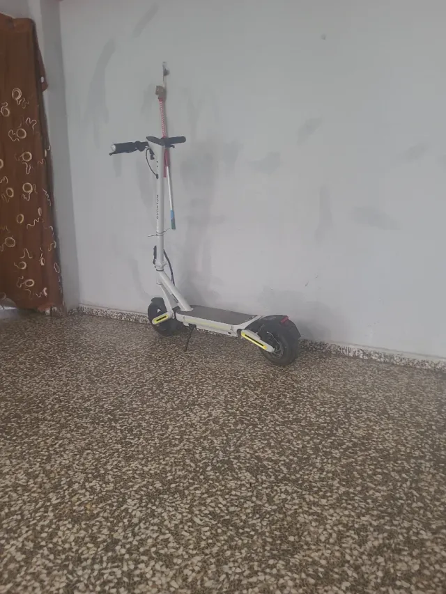 Detalles del productoPatinete eléctrico de color blanco, ideal para desplazamientos urbanos.