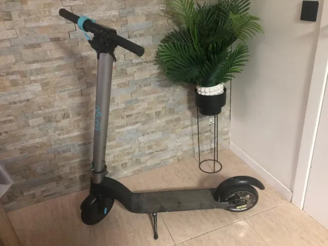 Patinete eléctrico de color gris y negro, con detalles en azul. - Manillar ajustable. - Rueda trasera con freno. - Pata de apoyo.negocable
