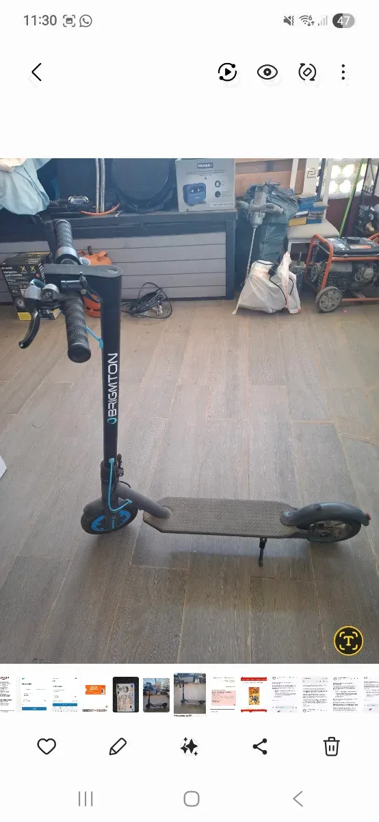 Patinete eléctrico de la marca BRIGHTON. - Color negro y azul. - Manillar plegable. - Ruedas con detalles azules.