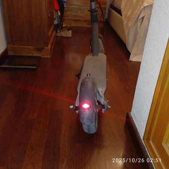 Patinete eléctrico con un diseño moderno y funcional. Perfecto para desplazamientos urbanos. - Luz trasera roja. - Rueda trasera visible.