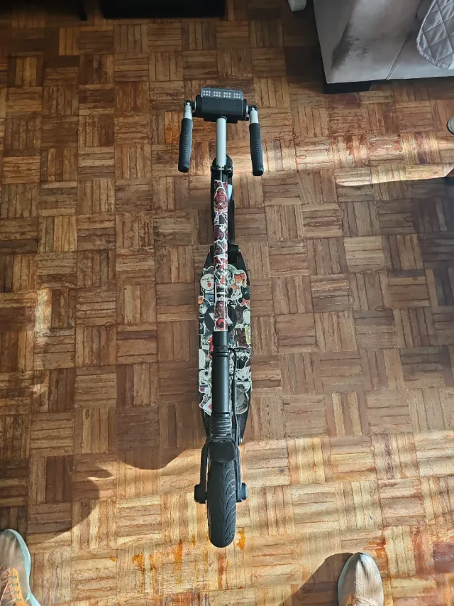 Detalles del productoPatinete eléctrico con un diseño único y llamativo, cubierto de pegatinas.