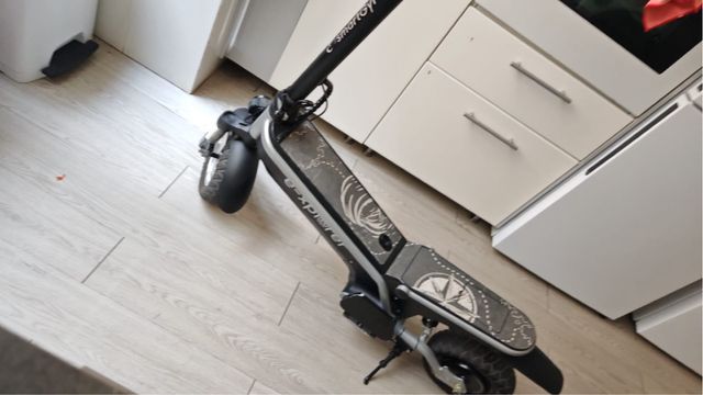 Detalles del productoPatinete eléctrico con un diseño moderno y detalles gráficos.