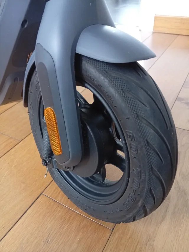 Patinete eléctrico modelo E2 Pro. - Color gris. - Rueda delantera con neumático. - Guardabarros delantero con reflectante naranja.