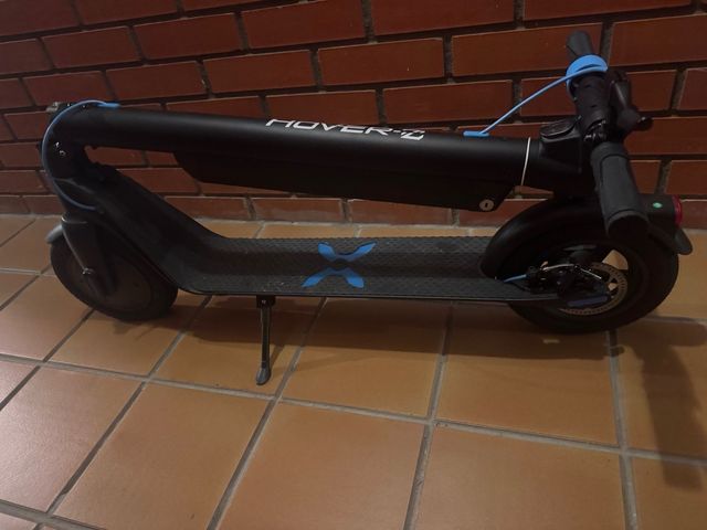 Detalles del productoPatinete eléctrico de color negro con detalles en azul.