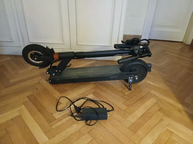 Detalles del productoPatinete eléctrico marca Joyor, ideal para desplazamientos urbanos. Se pliega fácilmente para su transporte y almacenamiento.
