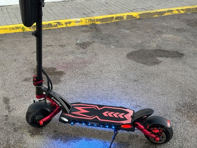 plegable, triple cierre, dos motores de 800w cada uno total 1600w, velocidad máxima 65km/h autonomía 65km, totalmente configurable potencia salida, regeneración de frenada, límite velocidad etc. luces de freno, intermitentes y luz perimetral, frenos semi hidráulicos, bolsa delantera. neumáticos nuevos, suspensión delantera y trasera.