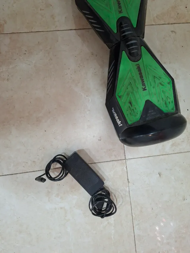 Patinete eléctrico Kawasaki con cargador. - Diseño en color verde y negro. - Marca Kawasaki visible en los laterales. Funciona perfectamente.