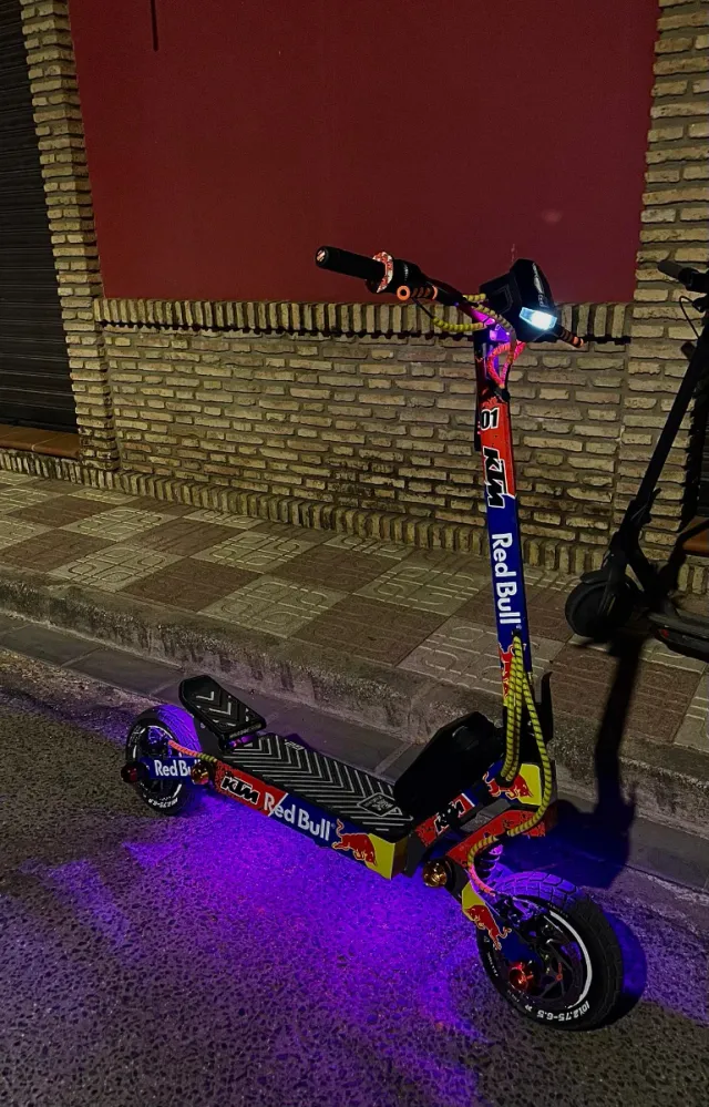 Patinete eléctrico personalizado con diseño de KTM y Red Bull. Cuenta con luces LED moradas. - Diseño deportivo. - Luces LED integradas.