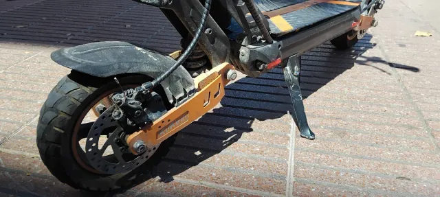 Patinete eléctrico Kukirin G2 Max en color negro y naranja. - Diseño robusto y moderno. - Suspensión delantera y trasera bateria deteriorada con cargador