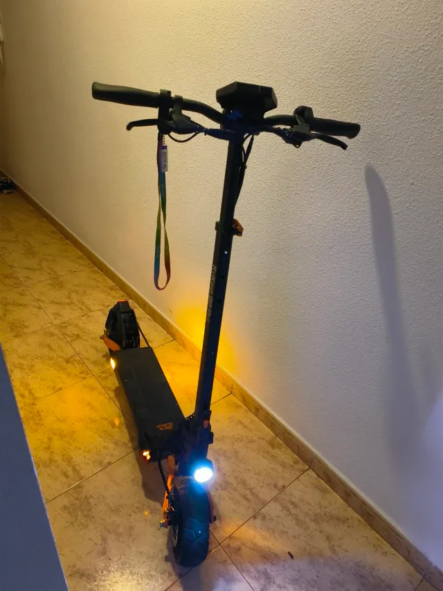 Detalles del productoPatinete eléctrico Kukirin G2 Pro en color negro y naranja. Cuenta con luces delanteras y traseras.