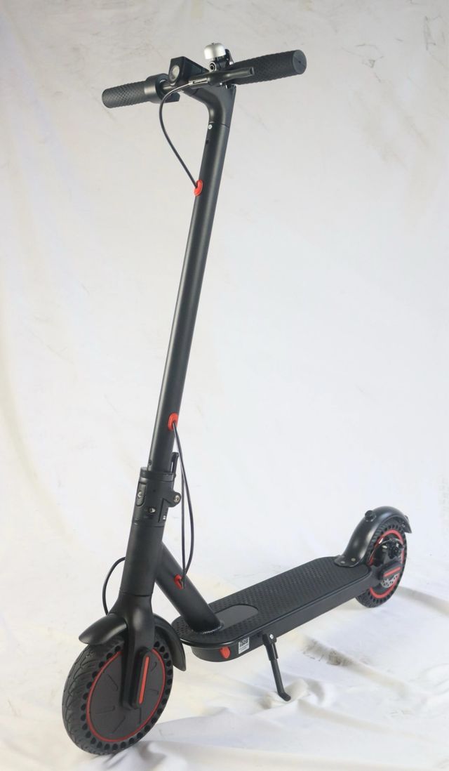 Patinete eléctrico en color negro, ideal para desplazamientos urbanos. - Diseño moderno y funcional. - Ruedas con detalles en rojo. - Velocidad: 30 km/h