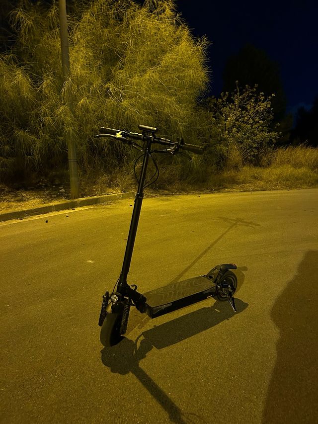 Detalles del productoPatinete eléctrico de color negro, ideal para desplazamientos urbanos.