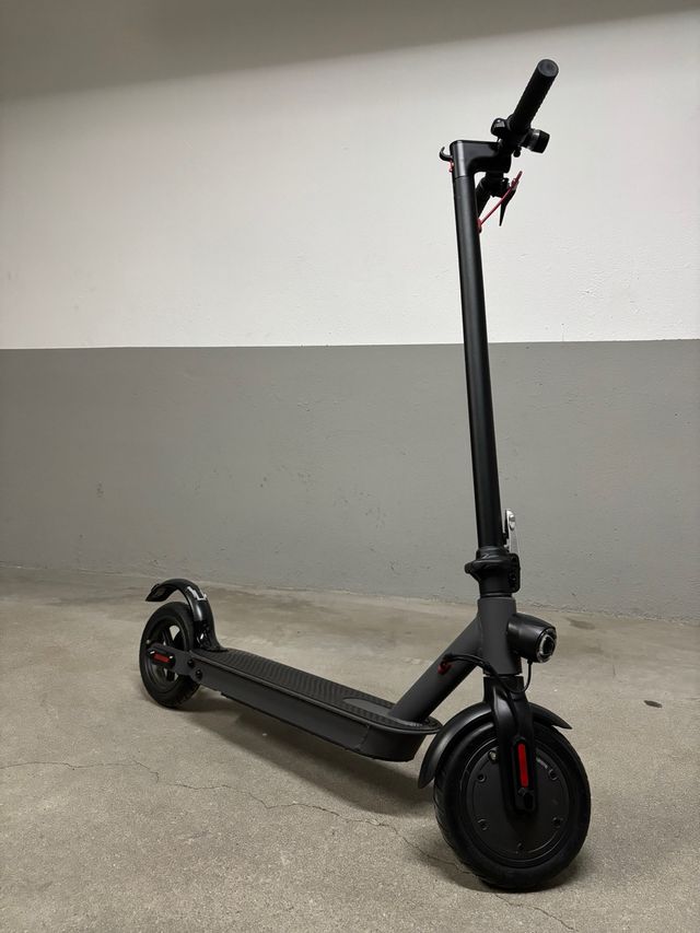 Detalles del productoPatinete eléctrico de color negro, ideal para desplazamientos urbanos.