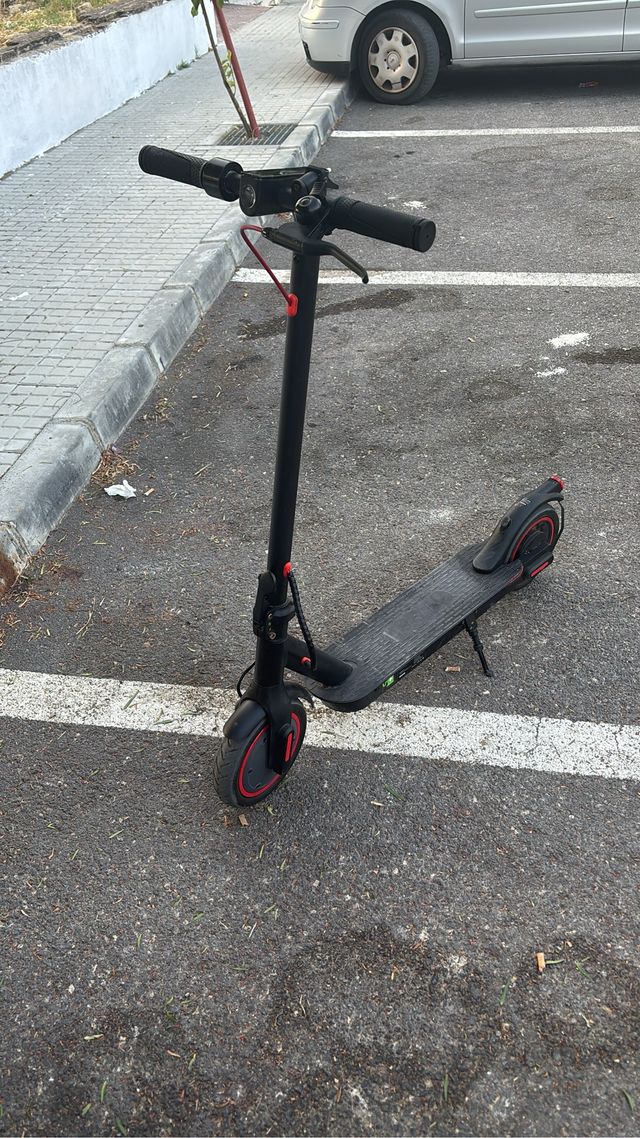 Patinete eléctrico en color negro, ideal para desplazamientos urbanos. - Manillar plegable. - Ruedas con detalles en rojo. - Freno trasero.