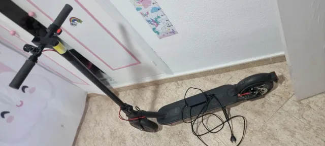 Patinete eléctrico en color negro, ideal para desplazamientos urbanos. Se encuentra en buen estado. - Manillar ajustable. - Ruedas resistentes. - Cargador incluido.