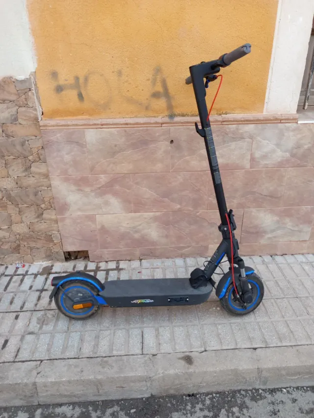 Patinete eléctrico en color negro con detalles en azul.