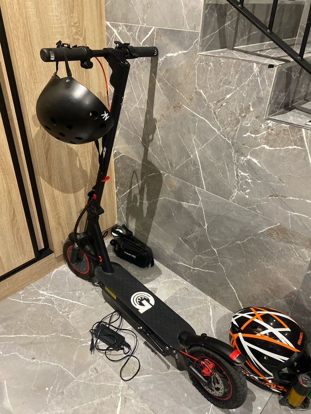 Patinete eléctrico en color negro, ideal para desplazamientos urbanos. - Diseño plegable. - Ruedas con detalles rojos. - Incluye cargador. Mas información al 604135611