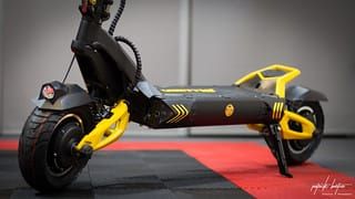 Detalles del productoPatinete eléctrico con un diseño llamativo en negro y amarillo.