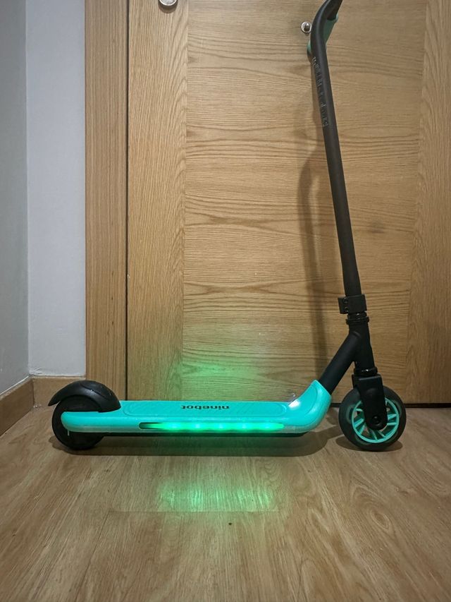 Detalles del productoPatinete eléctrico Ninebot en color turquesa, diseñado para niños. Cuenta con luces LED integradas en la base.
