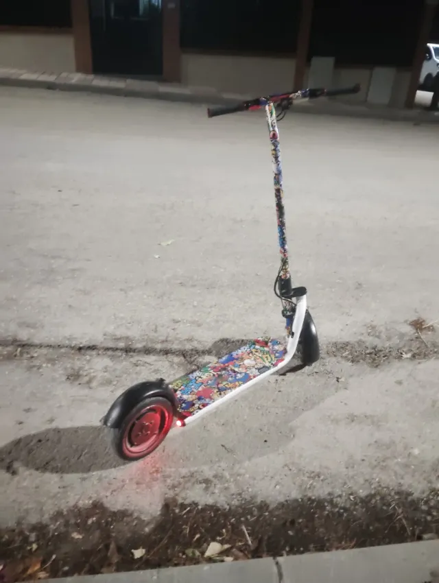 Detalles del productoPatinete eléctrico con un diseño único y llamativo, cubierto de pegatinas.
