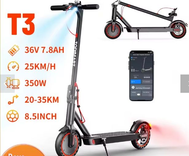 Motor de 350 W, 36 V, 7'8 mA/h, 25 km/h, 12 Kg, 30/35 Km de autonomía, conectable al móvil por Bluetooth, neumáticos de 8,5", etc...