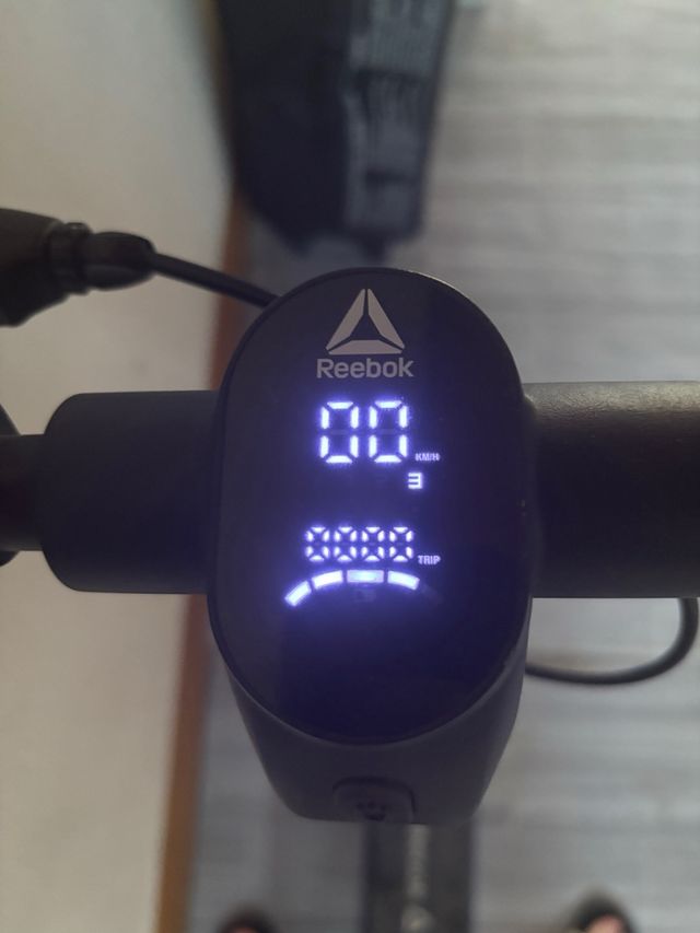 Detalles del productoPatinete eléctrico de la marca Reebok. Cuenta con pantalla digital para visualizar la velocidad y el modo de viaje.
