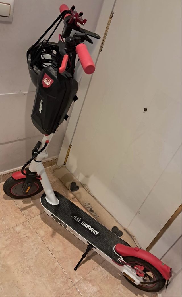 Detalles del productoPatinete eléctrico de la marca Sabway en color blanco con detalles en rojo. Incluye bolsa de transporte y casco.