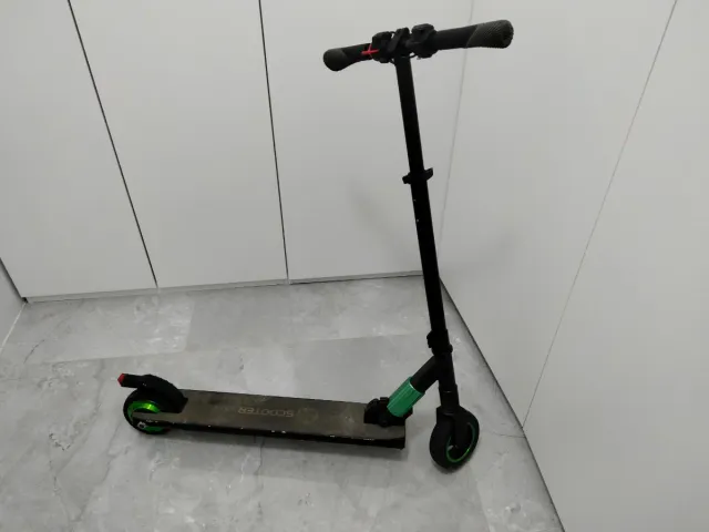 Patinete eléctrico modelo S1. - Color negro y verde. - Ruedas con detalles verdes. - Plataforma con texto 'SCOOTER'.