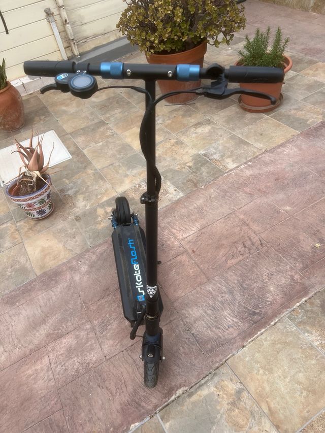 Patinete eléctrico SkateFlash en color negro con detalles azules. - Manillar ajustable. - Rueda delantera con suspensión. - Freno de disco.