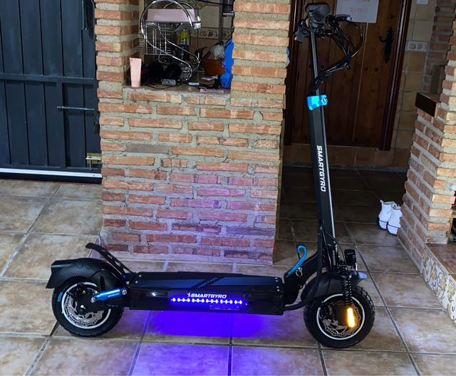 Detalles del productoPatinete eléctrico SmartGyro con luces LED azules.