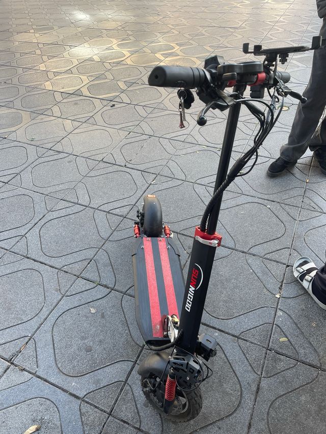 Patinete eléctrico SUNNIGOO con diseño deportivo. - Plataforma con franjas rojas. - Manillar negro con accesorios. - Ruedas delanteras y traseras.