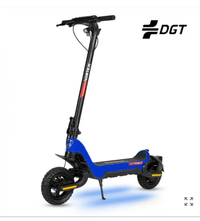 Patinete eléctrico Vortex Pro II en color azul. - Diseño moderno y deportivo. - Ruedas todoterreno. - Logo DGT en el manillar.