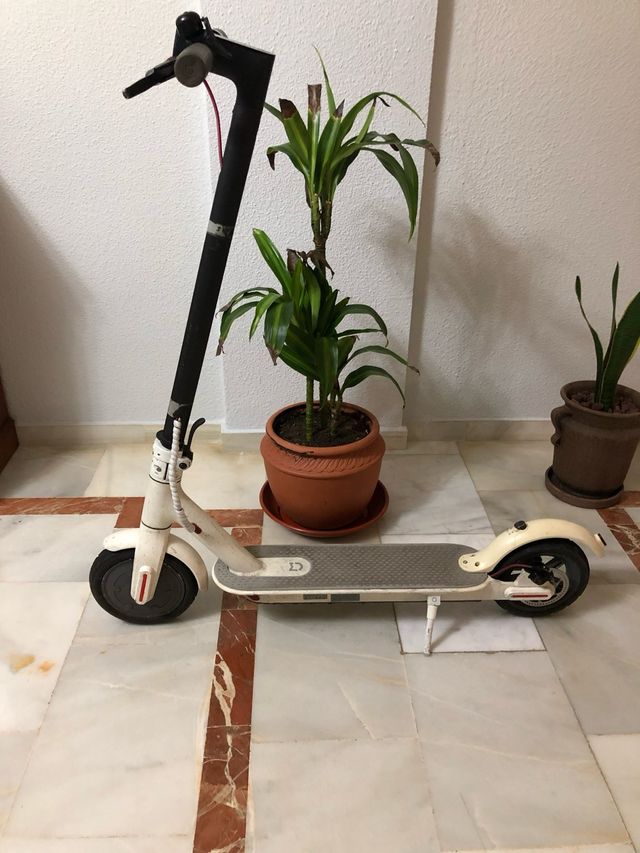 Detalles del productoPatinete eléctrico de color blanco y negro, ideal para desplazamientos urbanos.