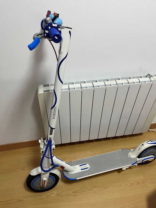 Detalles del productoPatinete eléctrico Xiaomi en color blanco con detalles en azul. Diseñado para desplazamientos urbanos.