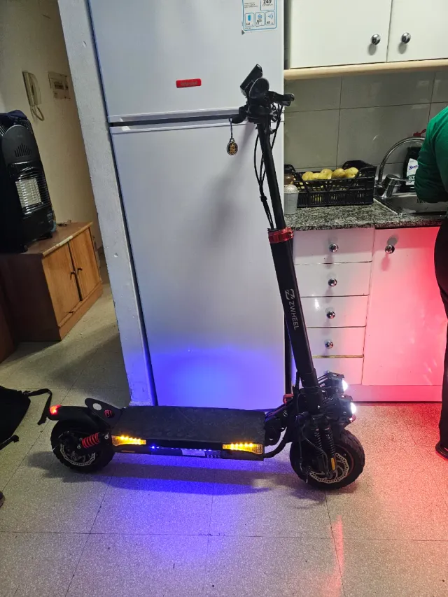 Patinete eléctrico ZWheell con luces LED. - Luces LED de ambiente azul. - Luces intermitentes naranjas. - Doble faro delantero. - Amortiguación delantera y trasera.
