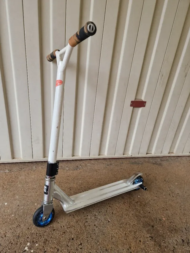 Patinete de estilo freestyle con manillar blanco y base plateada. Ruedas de marca excelentes y en pefecto estado. Patinete sin problemas ni fallos.