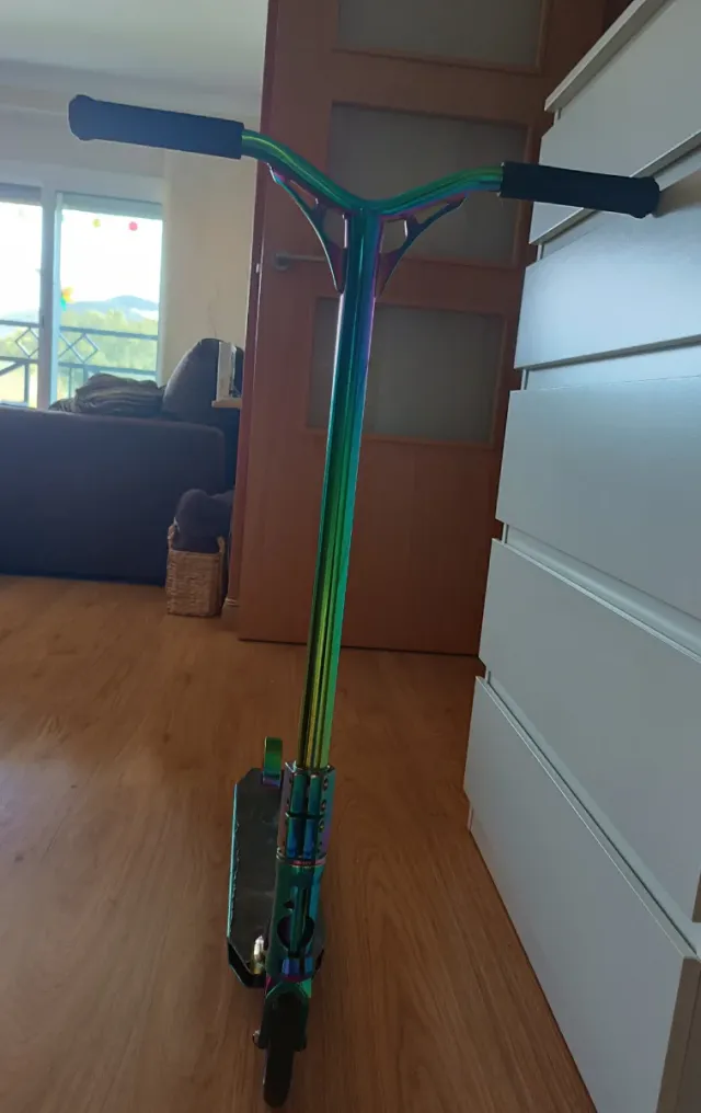 Detalles del productoPatinete con un diseño llamativo y acabado iridiscente. Cambiando la lija queda perfecto.