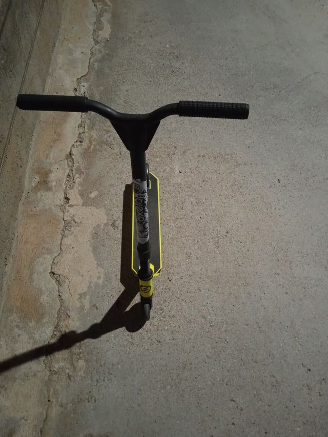 Detalles del productoPatinete de estilo freestyle con un diseño llamativo en negro y amarillo.