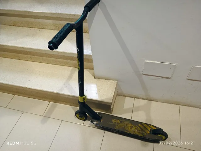 Detalles del productoPatinete de estilo freestyle con un diseño llamativo en negro y amarillo. Ideal para trucos y desplazamientos.