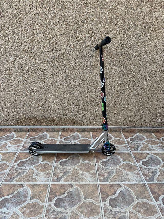 Patinete freestyle con una plataforma negra y manillar decorado con pegatinas. - Plataforma de aluminio. - Manillar negro con puños. - Ruedas con detalles de colores.