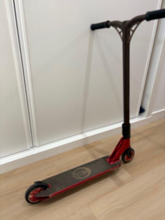 Patinete de estilo libre en color rojo. - Manillar con puños negros. - Base con detalles gráficos. - Ruedas negras y rojas.