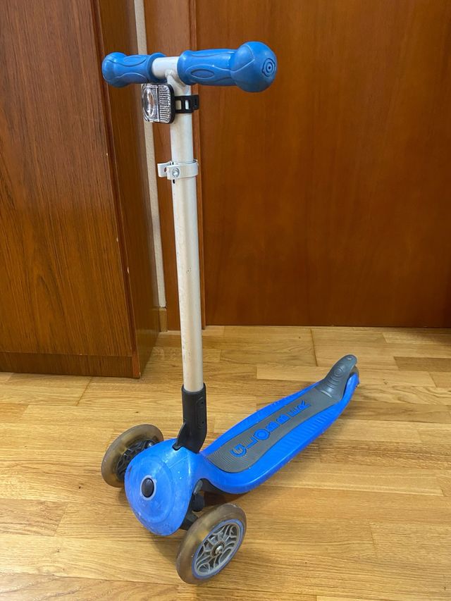 Detalles del productoPatinete de tres ruedas de color azul, ideal para los más pequeños. Diseñado para ofrecer estabilidad y diversión.