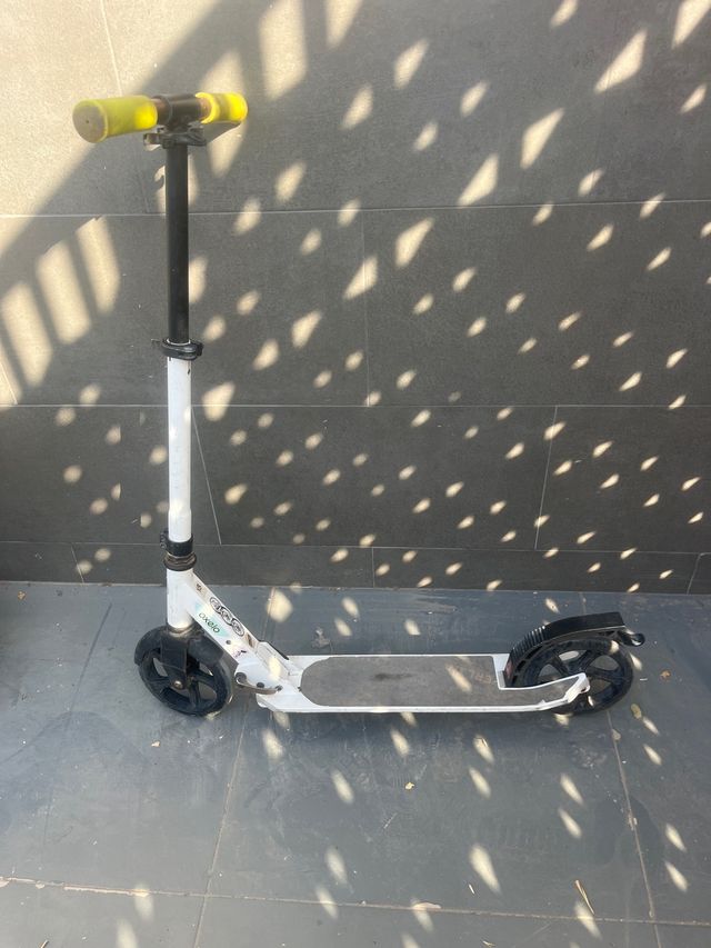 Detalles del productoPatinete Globber en buen estado. Es de color blanco y tiene empuñaduras amarillas.