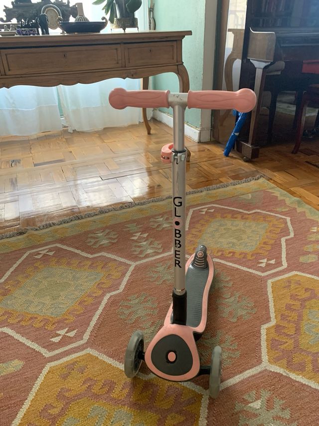 Detalles del productoPatinete infantil de tres ruedas en color rosa y gris. Las ruedas delanteras se iluminan al rodar.