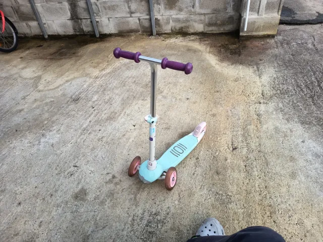Detalles del productoPatinete infantil Oxelo B1 500, de tres ruedas con manillar morado y base azul y detalles en rosa, de Decathlon.
