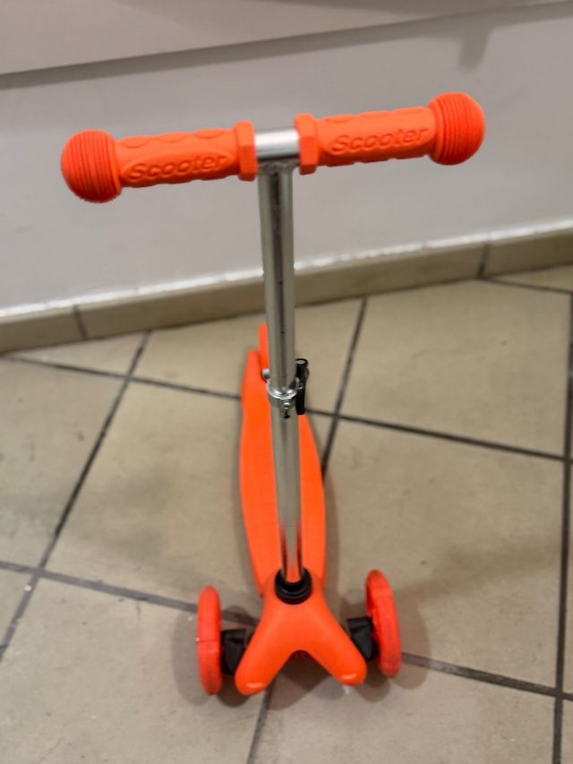 Detalles del productoPatinete de tres ruedas en color naranja, ideal para niños.